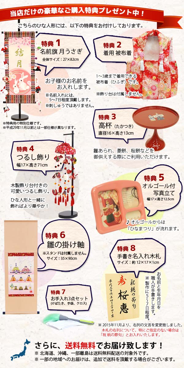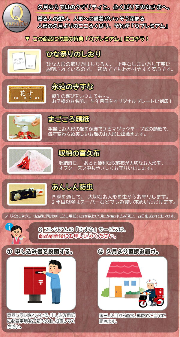 商品名(品番) 久月 衣裳着 檜製五人飾り 華節の宴 刺繍 駿河古典蒔絵 京九番親王 小三五官女 ≪HNQ-1068≫ 飾った際のサイズ 間口85×奥行80×高さ72cm ご購入特典など ●つるし飾り●名前旗 月ウサギ(製作に5〜7日程度)※ご購入特典用オリジナル仕様●雛の掛け軸●友禅 被布着(1〜3歳まで着用可能)●オルゴール付き写真立て ●高杯●お手入れ3点セット(けばたき、手袋、クロス)●名入れ木札※ 手書きにて一枚ずつ名入れを行っております。